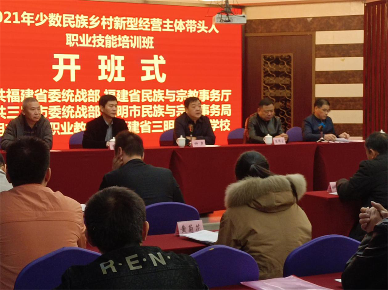本次培训班由中共福建省委统战部、福建省民族与宗教事务厅主办,中共三明市委统战部、三明市民族与宗教事务局承办,三明市中华职业教育社、三明市农业学校协办。开班式由市民族宗教局副局长赖德农主持,省民族宗教厅二级巡视员钟声作主旨讲话,参加开班式的还有省民族宗教厅陈锦云处长、市委统战部一级调研员曹观生、开云(中国)谢阳军副校长等同志。