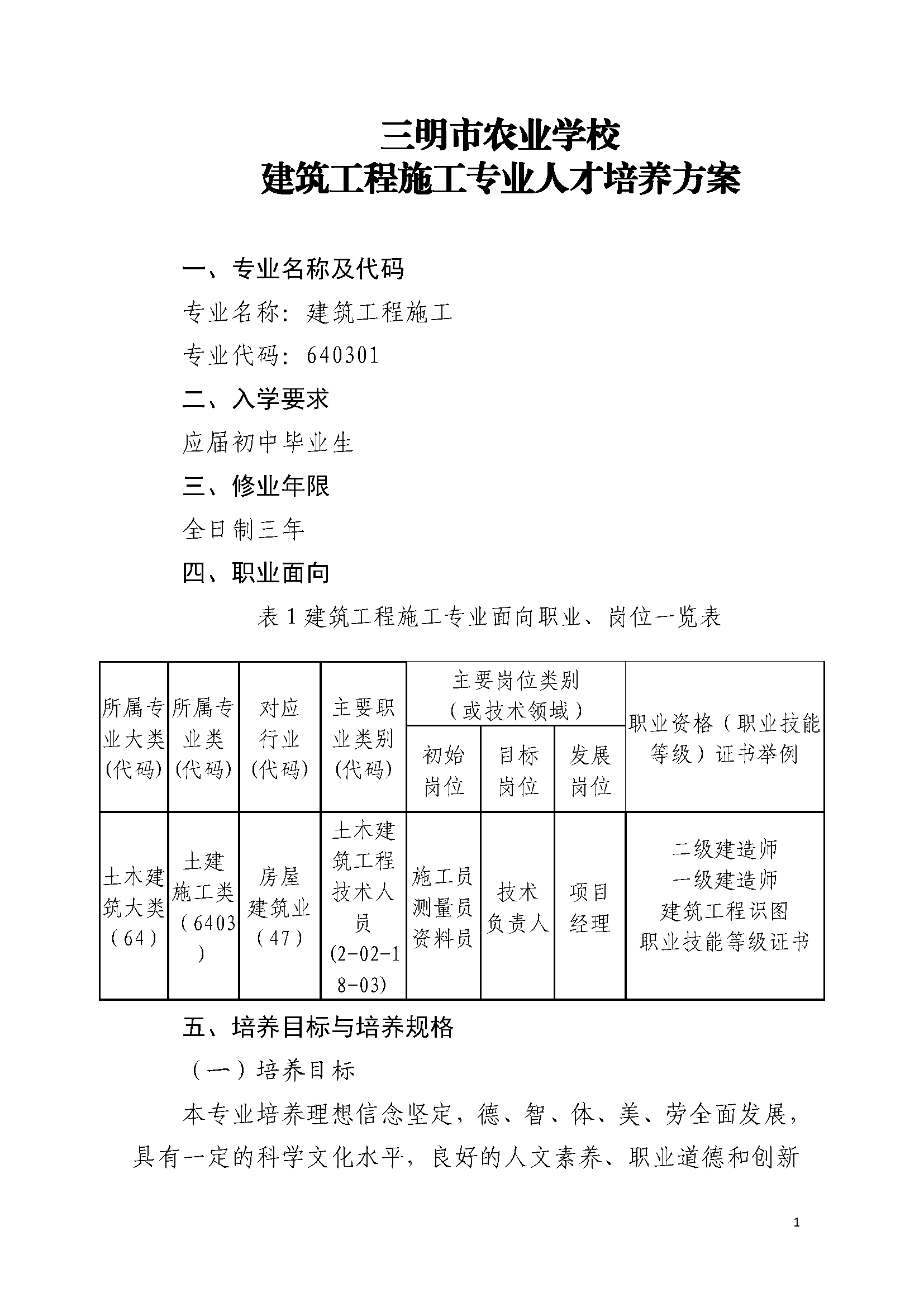 三明市农业学校建筑工程施工专业人才培养方案(2023)