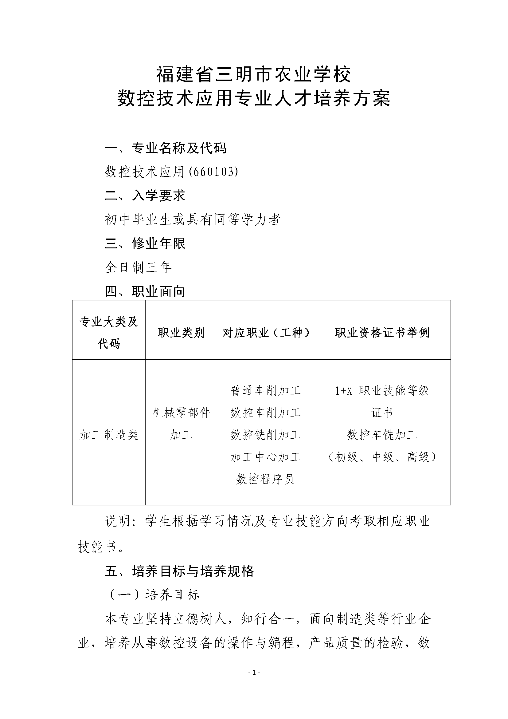 三明市农业学校数控技术应用专业人才培养方案(2023)
